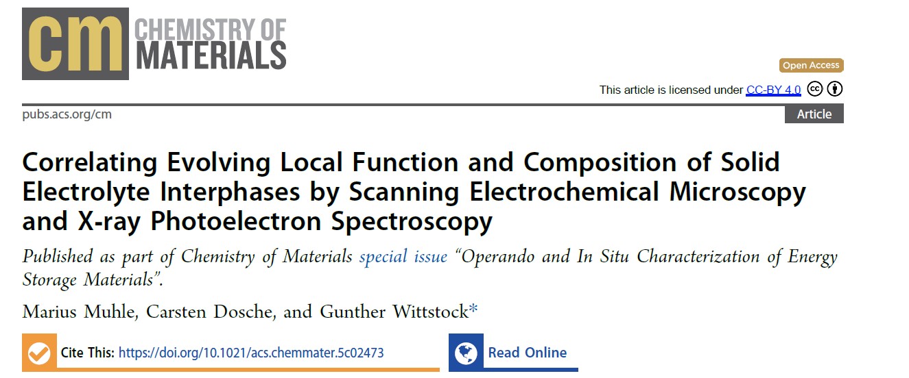 在锂离子电池、锂金属电池等储能器件中,固体电解质界面(SEI)层堪称 "隐形守护者"—— 它由电解质组分还原分解形成,既要允许锂离子快速传输,又要阻断电极与电解质间的无效电子转移,直接决定电池的循环稳定性、倍率性能与安全性。然而,SEI层是动态演化的纳米尺度异质结构,其局部功能与化学组成的关联一直是电池领域的研究难点。近日,《Chemistry of Materials》发表的一项创新研究,通过扫描电化学显微镜(SECM)与X 射线光电子能谱(XPS)的原位联用技术,成功破解了这一难题。